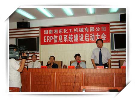 2007-06-29 為有效促進企業管理的現代化、科學化,進一步提升公司的綜合競爭力,湖南湘東化工機械有限公司于去年啟動了ERP系統的前期準備工作,今天上午,根據ERP項目的進展情況,正式啟動ERP信息系統建設。 ERP(企業資源規劃)是一種企業全新管理理念和管理工具,強調對企業的內部甚至外部的資源進行優化配置,提高利用效率。此次我公司斥資300多萬,首期投資150萬元,進行信息化建設,依照“整體規劃,分布實施,重點突破,效益驅動”的原則,分階段、按步驟地實施財務、物流、人力資源、生產管理、物料需求計劃等核心模塊建設,對企業管理進行流程梳理,促進公司經濟效益的最大化。圖為和佳軟件公司陳佳總經理不遠千里從北京總部蒞臨我公司出席啟動儀式。
